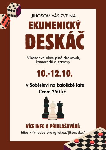Ekumenický Deskáč https://mladez.evangnet.cz/jihoceska/akce/ekumenicky-deskac/ KdeSoběslav DatumPá, 10.10.2025 - 19:00